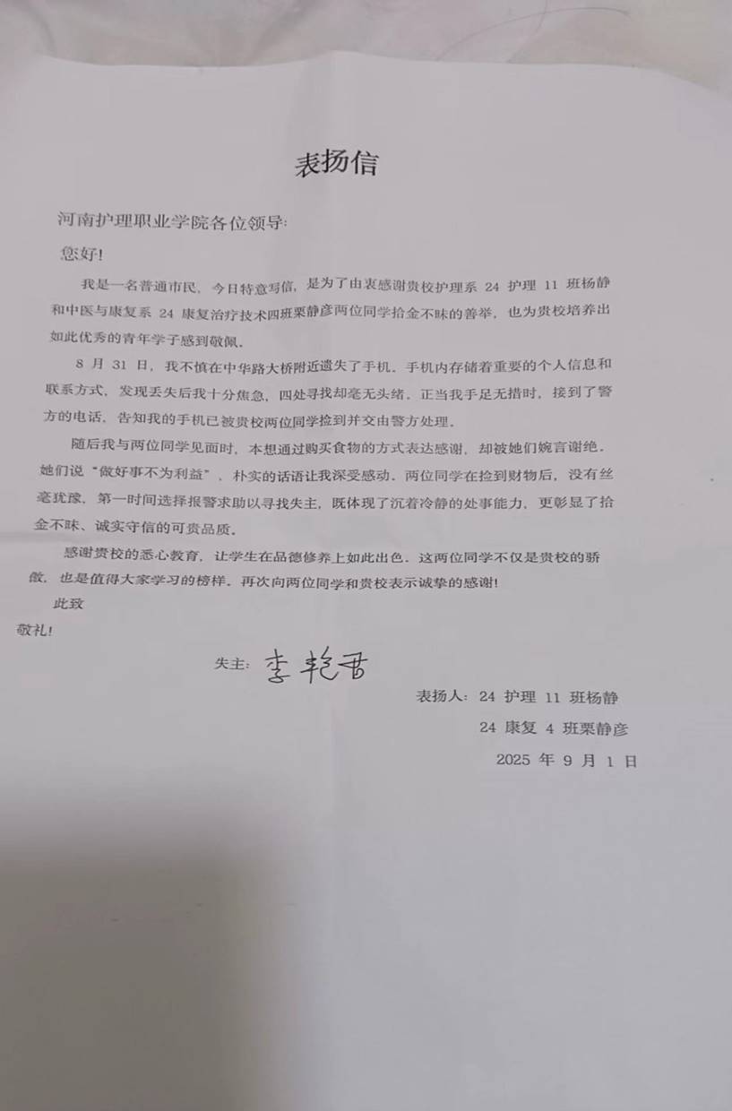 近日,市民李艳君将一封饱含深情的表扬信送到河南护理职业学院,字字都在诉说着对我校两名学子杨静、栗静彦拾金不昧善举的感激与敬佩。其中栗静彦系我系24康复治疗技术4班学生。