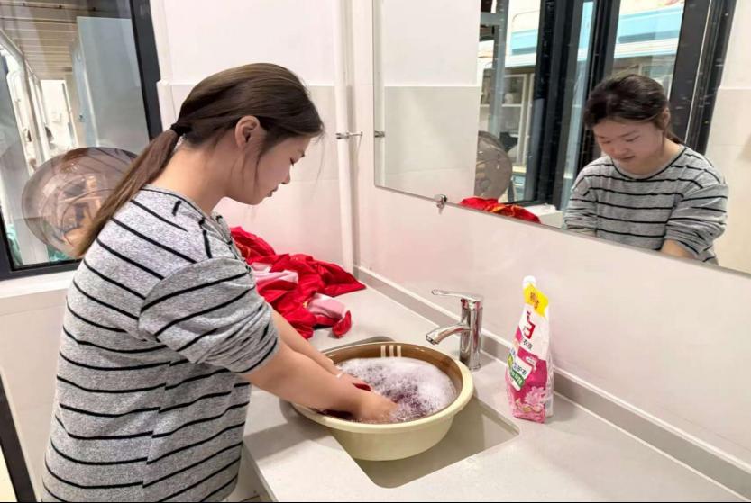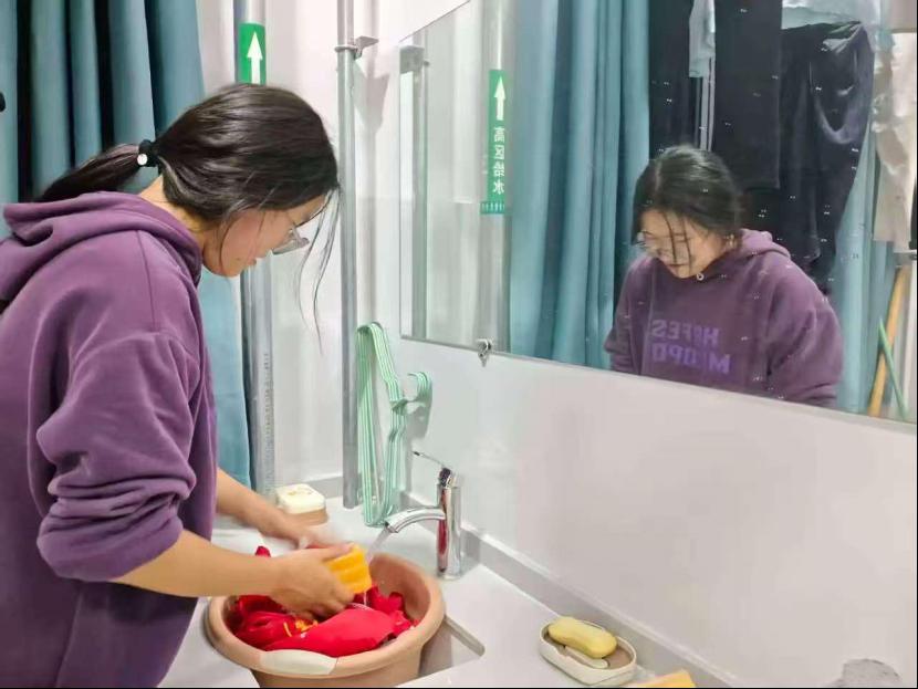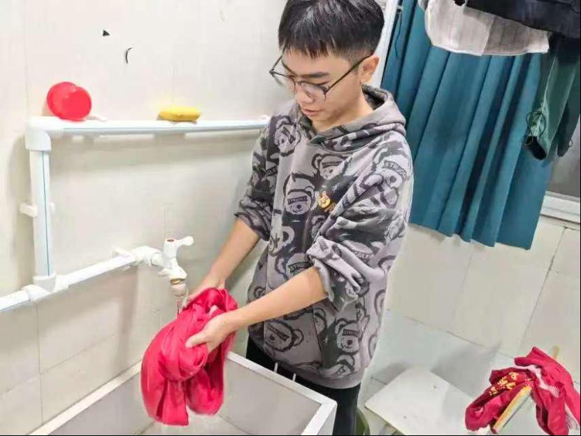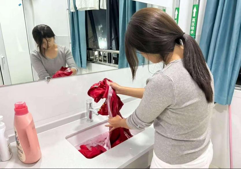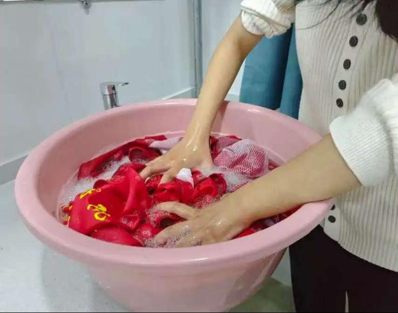 从浸泡、搓洗到晾晒,新生们亲手打理这些承载着迎新记忆的衣物,在劳动中回顾迎新点滴,更体会到“服务他人,成长自我”的志愿精神。“这件迎新志愿者的红马甲,我要亲手洗干净,像学长学姐一样为集体服务。”在学生宿舍的洗衣区域,来自中医与康复系的新生志愿者同学正认真清洗着迎新时的红马甲。这是我系“劳动践初心·迎新续温暖”系列活动的一个缩影。